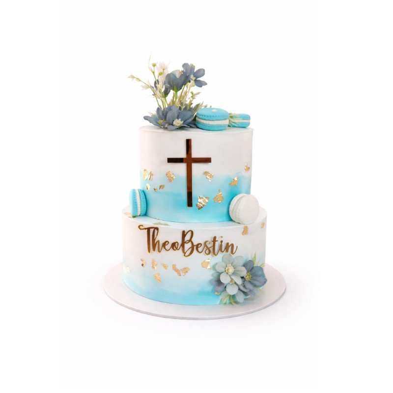 A beautifully decorated cake designed for baptism celebrations, made with soft sponge layers and creamy …